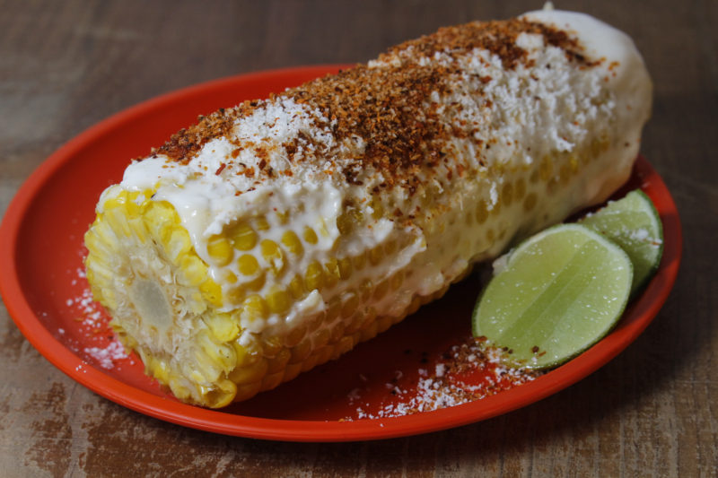 • Elote blanco (mex) con mayonesa, queso y chilito