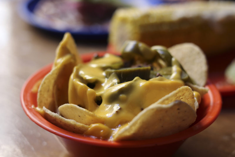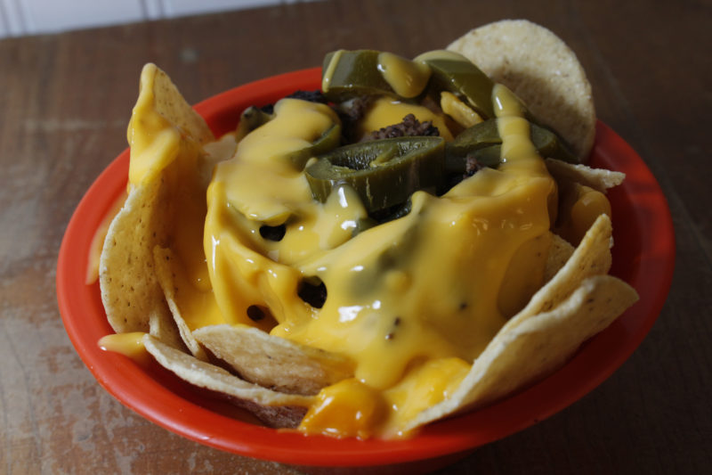 • Nachos con queso y carne asada
